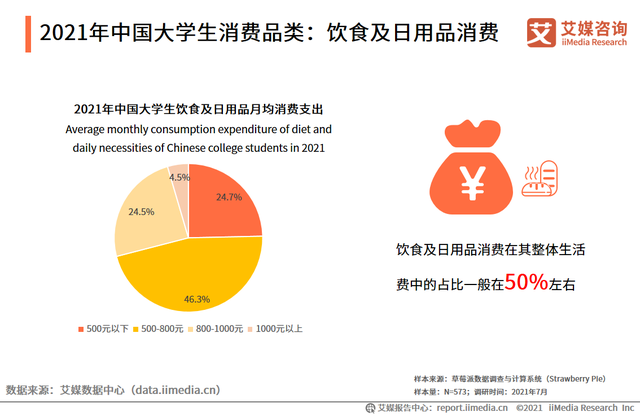 iiMedia Research(艾媒咨询)调研数据显示,46.3%的大学生平均每个月在饮食及日用品上的消费支出为500-800元,800-1000元的占比为24.5%,而在1000元以上的占比仅为4.5%。饮食及日用品消费是大学生生活的刚需消费,结合大学生月均生活费来看,饮食及日用品消费在其整体生活费中的占比一般在50%左右。